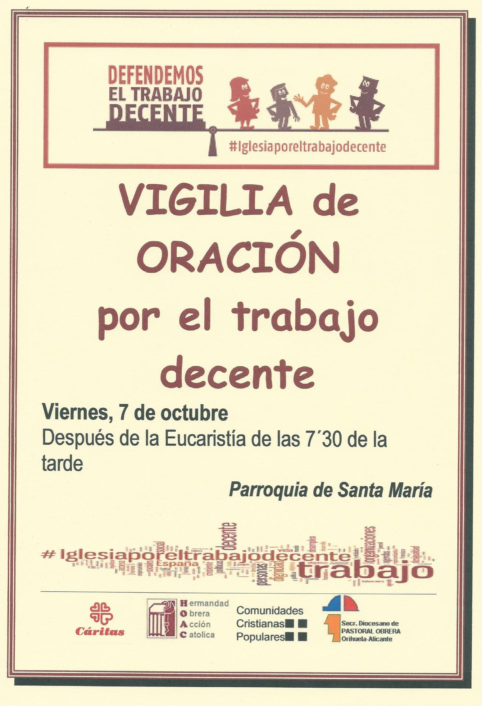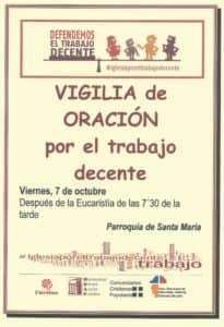 El próximo viernes, día 7 de octubre, con motivo de la Jornada Mundial por el Trabajo Decente, se celebrará una vigilia de oración en la Parroquia de Santa María, tras la celebración de la eucaristía de las 7´30 de la tarde. Nos motiva el Plan Diocesano de Pastoral, para que iluminados por la Fe, podamos acompañar, desde la reflexión y la acción, a quienes buscan cauces e iniciativas para crear empleo decente, que nos enseñe a valorar el trabajo digno y a seguir concienciando para que a nadie le falte.