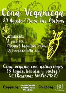 Desde la Plataforma Animalista de Villena queremos invitar a la ciudadanía de Villena y alrededores el próximo sábado 29 a acompañarnos a una cena con espectáculos y diversas sorpresas en la Plaza de las Malvas.