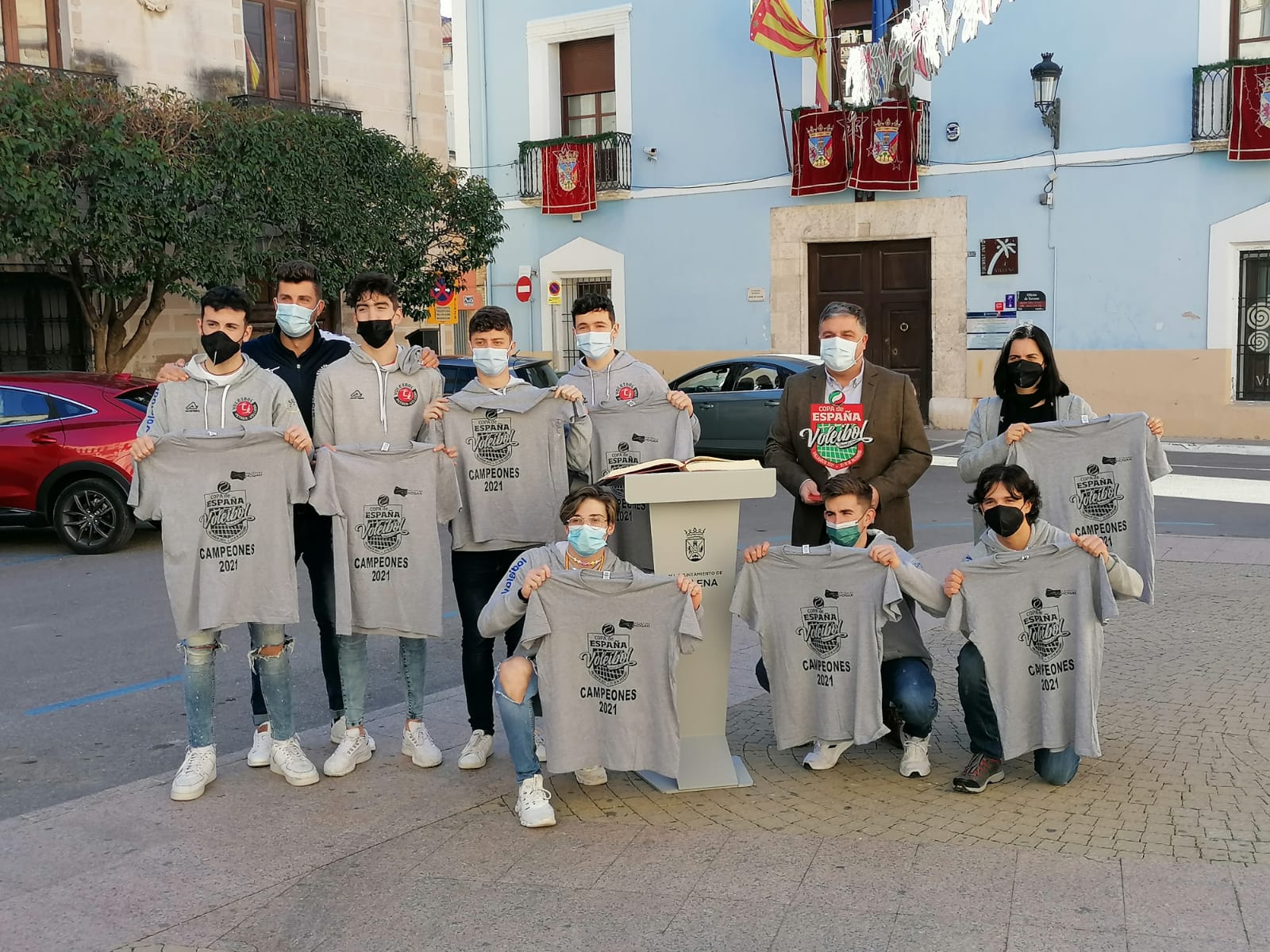 El alcalde de Villena, Fulgencio Celdrán, y la concejala de Deportes, Maite Gandía, han recibido hoy a los componentes del equipo juvenil masculino de voleibol formado por miembros del Club Voleibol Villena y el Santo Domingo Voleibol Petrer que se ha proclamado Campeón de la Copa de España 2021.