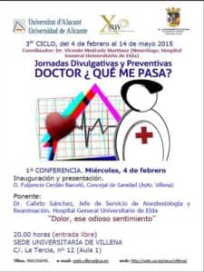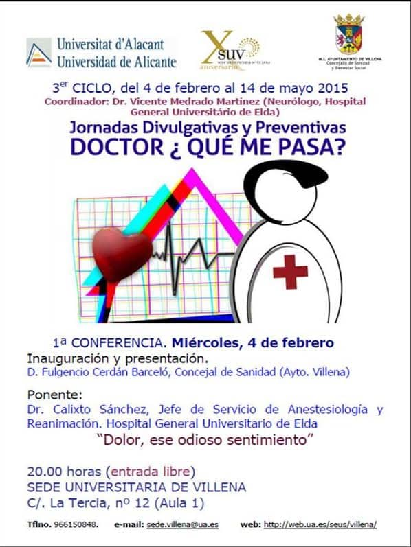 “La Sede Universitaria de Villena, presenta este miércoles día 4, a las 20’00 de la tarde en La Tercia, el ciclo divulgativo, “Doctor, ¿Qué me pasa?” con la conferencia “Dolor, ese odioso sentimiento” a cargo del Dr. Calixto Sánchez, Jefe del Servio de Anestesiología y Reanimación del Hospital General Universitario de Elda.