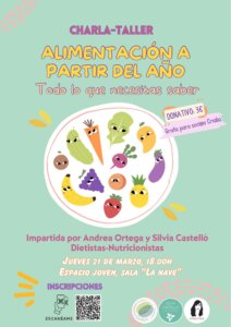 Para ello contaremos con las diplomadas en Nutrición Humana y Dietética Andrea Ortega y Silvia Castelló, que nos hablarán de los cambios más importantes que se dan en la alimentación de niños y niñas a partir del año (selectividad a la hora de escoger alimentos, neofobias alimentarias, …), nos darán recomendaciones de frecuencia de consumo de alimentos, nos hablarán de los nutrientes más importantes y de opciones saludables para llevar al cole y resolverán todas nuestras dudas.