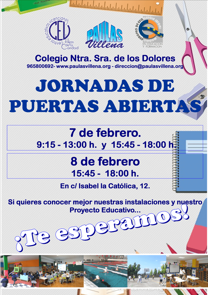 El colegio Ntra. Sra. de los Dolores (Paulas) de Villena, va a realizar unas Jornadas de Puertas Abiertas los próximos días 7 y 8 de febrero. La finalidad de estas Jornadas es dar a conocer tanto las instalaciones como el proyecto educativo del centro, a aquellas familias que próximamente deberán escolarizar a sus hijos de 3 años y a cualquier familia interesada en conocernos. El horario de estas Jornadas es el siguiente: