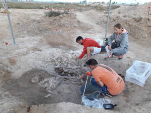 El trabajo de excavación es meticuloso, para poder documentar capa a capa los múltiples restos óseos pertenecientes a varios ejemplares depositados, aparentemente sin cuidado, en una gran fosa. Este hallazgo se debe poner en relación con los de los baños localizados en el año 2006 en una parcela próxima. Una vez extraídos del subsuelo, se depositarán en el laboratorio del Museo para su estudio.