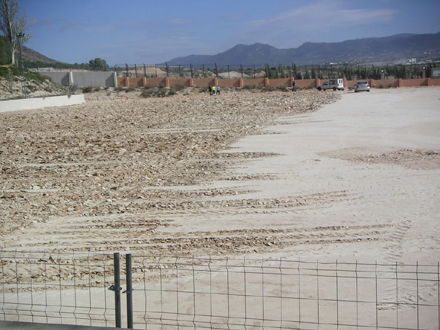Con un presupuesto de salida valorado en 400.000€, incluyendo la dirección de obras, el campo de césped artificial, prometido por el equipo de gobierno desde el comienzo de la legislatura, está muy cerca de convertirse en realidad. Con la adecuación de la parcela, el retiro de diversos árboles sobre la rambla y la llegada de grandes maquinarias esta semana, se vaticinaba el inminente comienzo de las obras.
