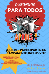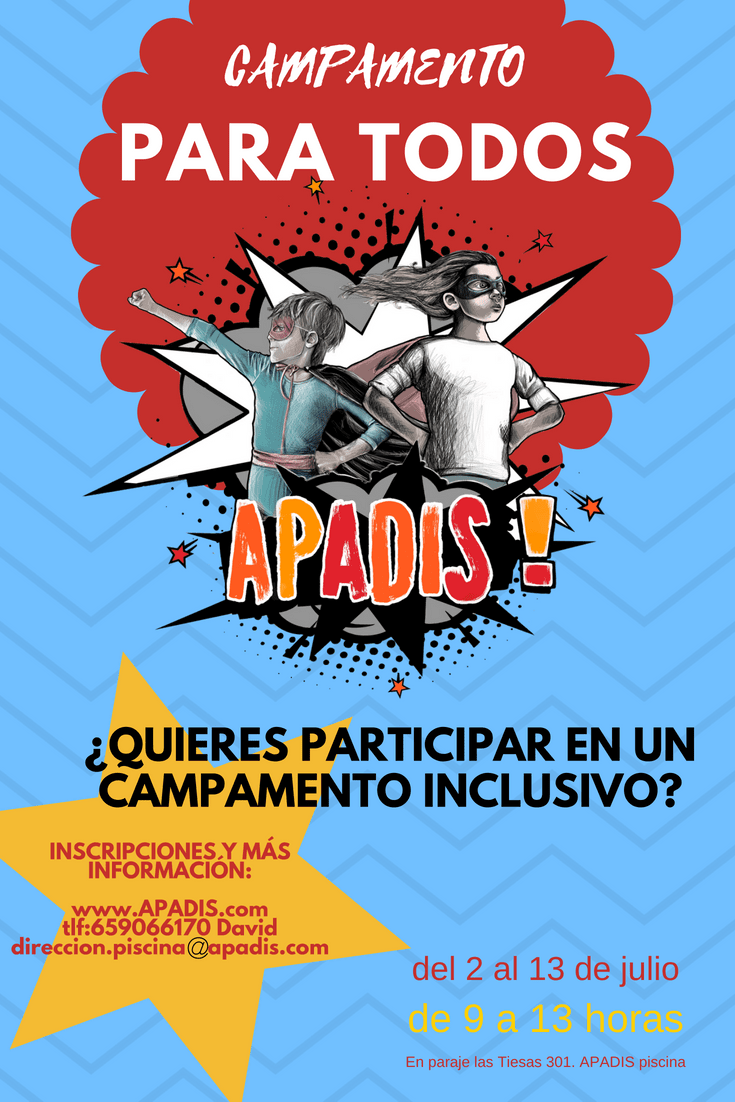 Y para terminar, como en años anteriores, del 2 al 13 de Julio llega una nueva edición del Campamento para todos, un campamento inclusivo donde niños y niñas de todas las edades podrán pasar unos días de diversión en las instalaciones de la piscina y en los alrededores de nuestras instalaciones de la carretera de Peñarubia.