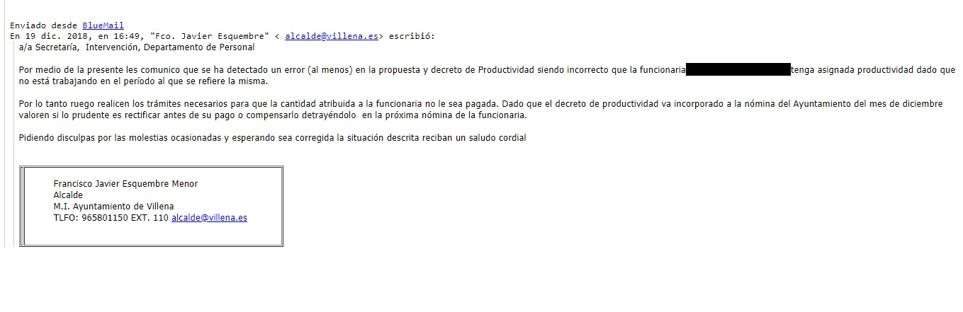 Como se muestra en el documento adjunto, la controversia generada no tendría que tener lugar porque desde que se supo del error a primera hora de la tarde de ayer, se comunicó por email la anulación de la productividad sobre la trabajadora en baja laboral y esta mañana, antes de conocer la falsa acusación de sustracción, se confirmó mediante otro escrito dirigido al señor Secretario así como al jefe de Recursos Humanos y al señor Interventor.