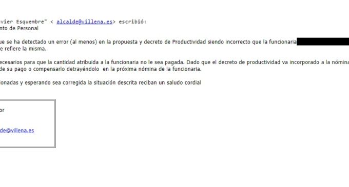 En relación a la noticia aparecida sobre el decreto de productividad para el personal municipal, desde el Ayuntamiento de Villena se informa que, efectivamente en la tarde de ayer miércoles se detectó un error sobre el listado de productividad en el cual no debía aparecer, al menos, una persona por encontrarse de baja laboral. Inmediatamente, alrededor de las 4 de la tarde, se envió desde Alcaldía escrito al Departamento de Personal, Secretaria e Intervención para que se anulara esa cantidad detrayéndola de la nómina en curso, o de la siguiente, si detener entonces el proceso impedía el pago de la nómina al resto del personal municipal.