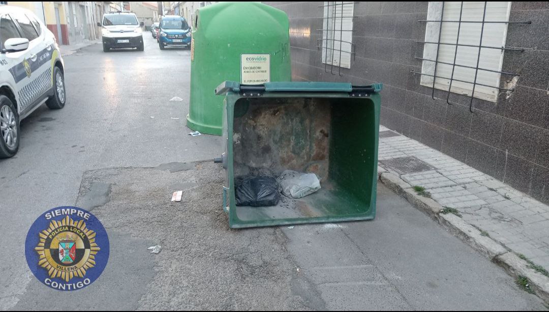Hoy las patrullas dexla Policía Local de Villena han acudido a un conato de incendio de un contenedor de residuos sólidos urbanos (contenedor verde).