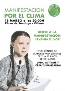 Empezamos este Viernes 15 de marzo, con un evento que tendrá lugar en el Centro de Mayores de la Plaza Mayor de 18:00 a 20:00 horas, y al que invitamos a participar a los y las jóvenes de 11 a 16 años. Durante el mismo se proyectarán algunos cortos que muestran los efectos del hombre en la Tierra, además de poner a disposición un espacio y materiales para elaborar, pancartas y mensajes, que se podrán compartir en la concentración que se realizará después en la Plaza de Santiago a las 20:00 horas.