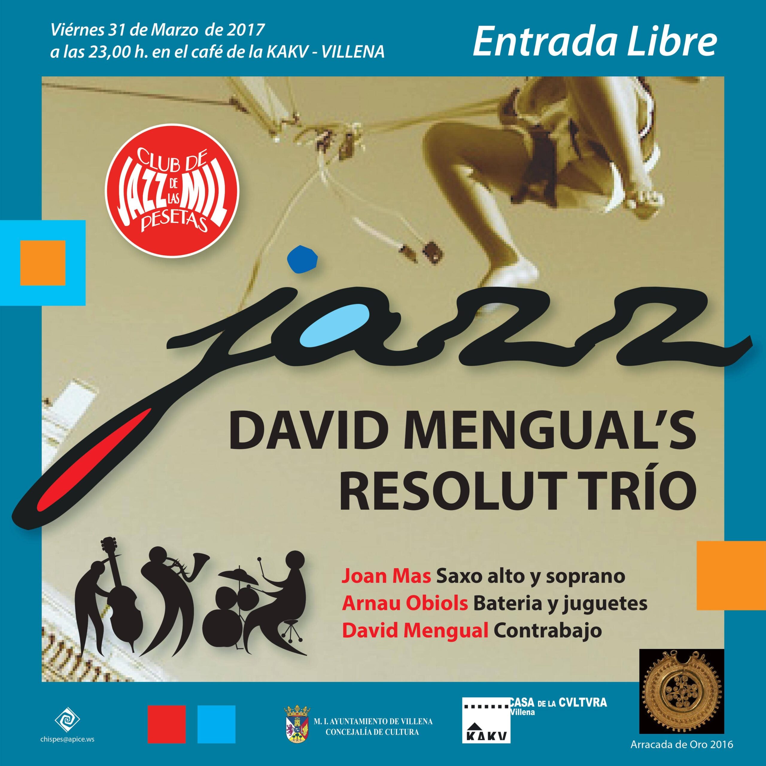 El viernes 31 de marzo el Club de Jazz de las Mil pesetas ha organizado un nuevo concierto en la cafetería de la Casa de la Cultura, con David Mengual’s Resolut Trio.