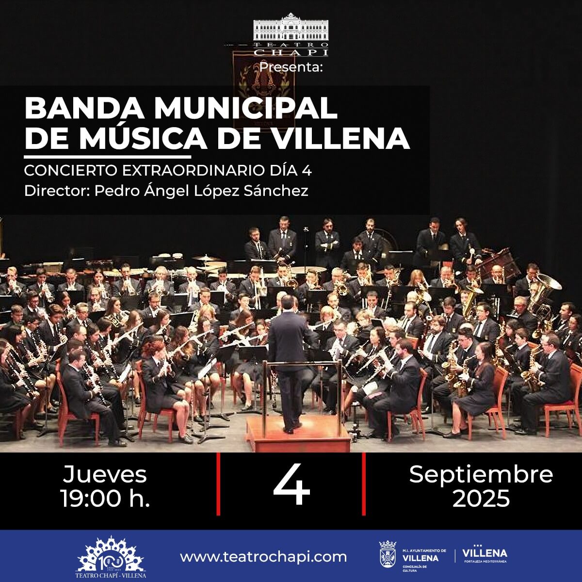Como es tradición, las Fiestas de Moros y Cristianos tienen su comienzo el día 4 de septiembre con el Concierto Extraordinario que ofrecerá la Banda Municipal de Música de Villena a las 19’00 h. en el Teatro Chapí. Previamente, el miércoles 3 de septiembre el Teatro llevará a cabo una Jornada de Puertas Abiertas en tres turnos desde las 11’30 AM previa inscripción gratuita en el teléfono del propio Teatro.