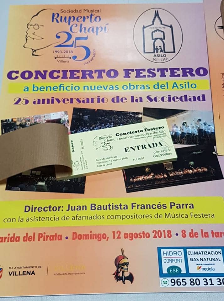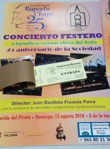 Como viene siendo tradicional en el mes de Agosto, la Sociedad Musical Ruperto Chapí tiene a bien realizar un maravilloso concierto con música festera con fines benéficos. En el presente año, y debido a las obras de rehabilitación del Asilo de Ancianos, la donación irá destinada a favor de esta centenaria entidad, que pretende mejorar las instalaciones y por lo tanto los servicios, para las personas mayores que allí residen.