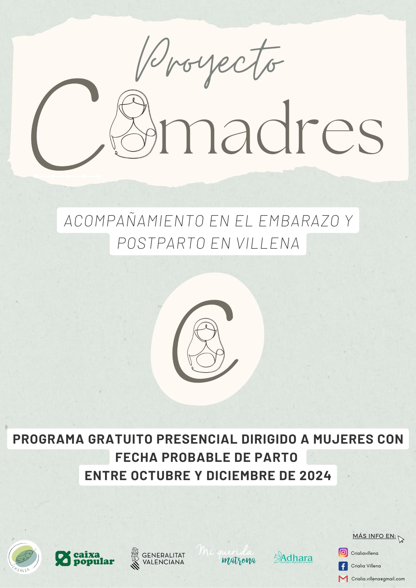 Comadres es un proyecto dirigido a mujeres embarazadas de Villena y comarca, con fecha probable de parto entre octubre y diciembre de 2024. Es gratuito y las plazas son limitadas. Las interesadas en inscribirse o recibir más información pueden escribir a crialia.villena@gmail.com.