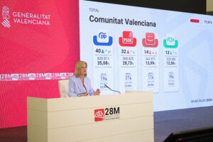 Por último, en la circunscripción de Valencia se han elegido 40 diputados y diputadas. Con el 67,02 % de participación, el PP ha obtenido 15 representantes; el PSOE, 13; Compromís tendrá 7 escaños y VOX suma 5 diputados.