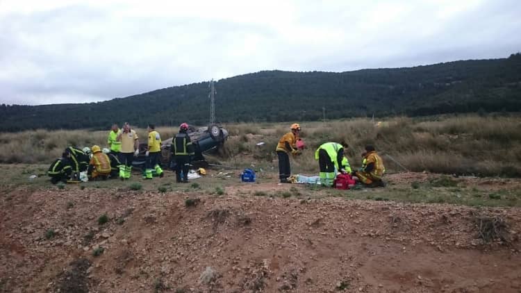Los bomberos de Villena se desplazaban de inmediato al lugar del siniestro que se encontraba dentro de termino municipal de Almansa, encontrándose con un vehiculo que se había salido de la vía, y se encontraba volcado sobre su techo, confirmándose la existencia de dos personas atrapadas en el interior del vehiculo y otras dos que se encontraban fuera del mismo con heridas de gravedad, de inmediato los bomberos de Villena junto con los bomberos de la vecina localidad de Almansa que también se han desplazado al lugar y dotaciones sanitarias del SESCAM de Castilla la Mancha. Han iniciado las labores de rescate y atención a los heridos, que una vez en las ambulancias han sido trasladados a los hospitales de Almansa y Albacete.Miembros de la DGT, también se personaban en el lugar para regular el trafico y la posterior investigación de las causas del accidente.