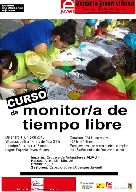 El próximo viernes 18 de enero, a partir de las 10:30 horas de la mañana, se abrirá el plazo de inscripción del curso de Monitor de Tiempo Libre Infantil y Juvenil, que se celebrará en Villena durante los meses de enero a junio de 2013, organizado por las Concejalías de Juventud de los Ayuntamientos de Villena y Biar, e impartido por Abast Animació, con una duración de 250 horas lectivas (125 teóricas y 125 prácticas). Se trata de una titulación homologada por el Instituto Valenciano de la Juventud.