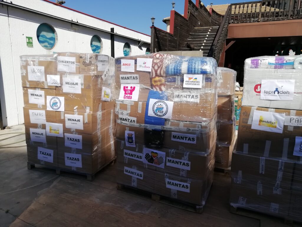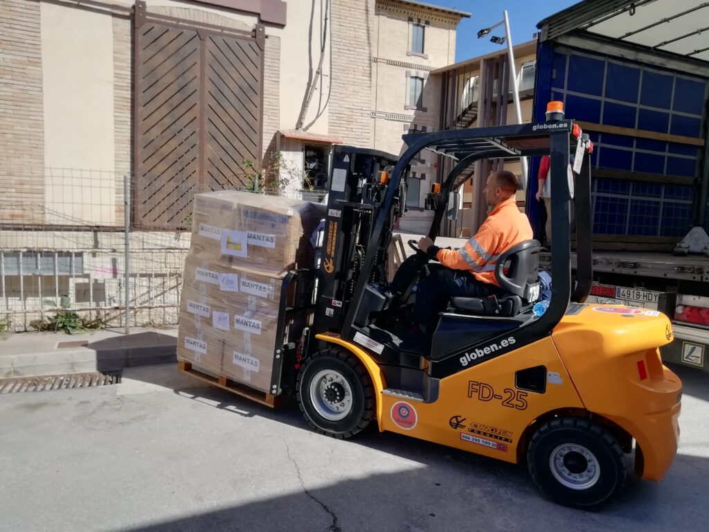 Este envío tendría que haber salido hace unos días, pero el parón por la huelga de transportes nos hizo volver a cribar los palets para clasificarlos por material y de esta manera darle prioridad a alimentos, productos de higiene y mantas.