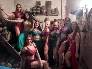 R. Pues todas las chicas somos de alma inquieta, así que es muy variado porque todas aportan ideas a los espectáculos. Por un lado tenemos el viernes y sábado noche “Brujas: el despertar del fuego” donde mezclamos danzas árabes, tribal y elementos de fuego. Desde hace unos años añadimos al espectáculo una queimada que luego repartimos entre el público mayor de edad. Hace un año una de las chicas que es profesora de instituto añadió una “pócima sin alcohol” para que nadie se sintiese excluído pensando en los que no alcanzan la edad o los que no beben alcohol. El sábado por la mañana y domingo por la tarde tenemos nuestro espectáculo de danzas árabes y orientales que este año participan muchas chicas de otras zonas además de las villeneras: Castalla, Ibi, Petrer, Alicante… ¡hasta viene mi amiga y compañera Ana de Navarra, tudelana!
