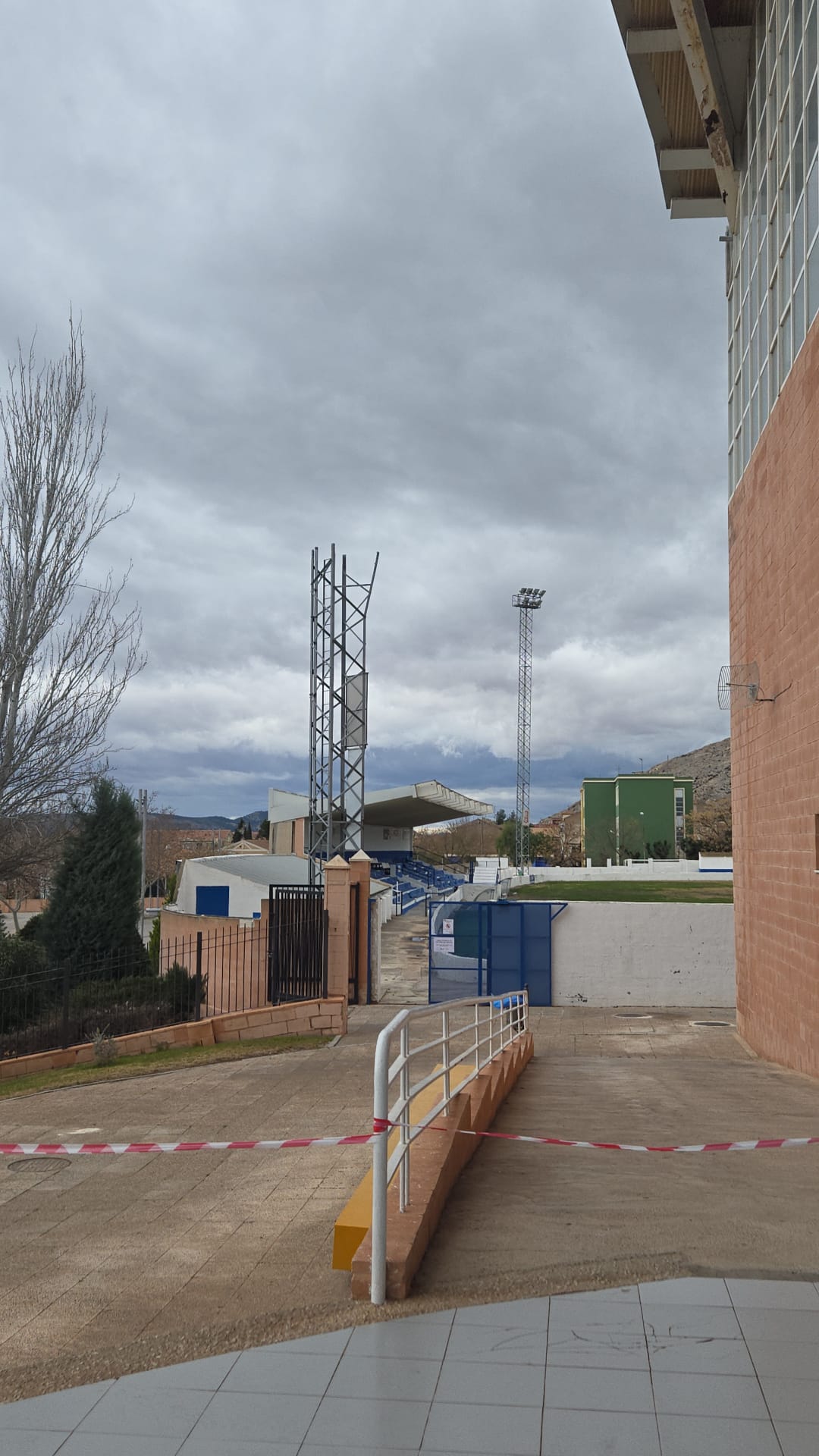 El pasado lunes, una torre de iluminación del campo de fútbol se precipitó sobre la cubierta del pabellón como consecuencia del viento, además de otros desperfectos en otras áreas y zonas de juego del polideportivo municipal.
