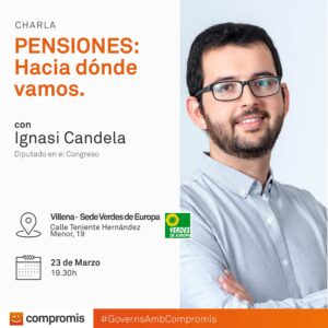 El diputado en el Congreso de Compromís, Ignasi Candela, abordará la situación de las pensiones en una charla informativa que tendrá lugar el próximo viernes, 23 de marzo a las 19.30 horas en la sede de Los Verdes de Europa situada en la calle Teniente Hernández Menor, 19 de Villena.