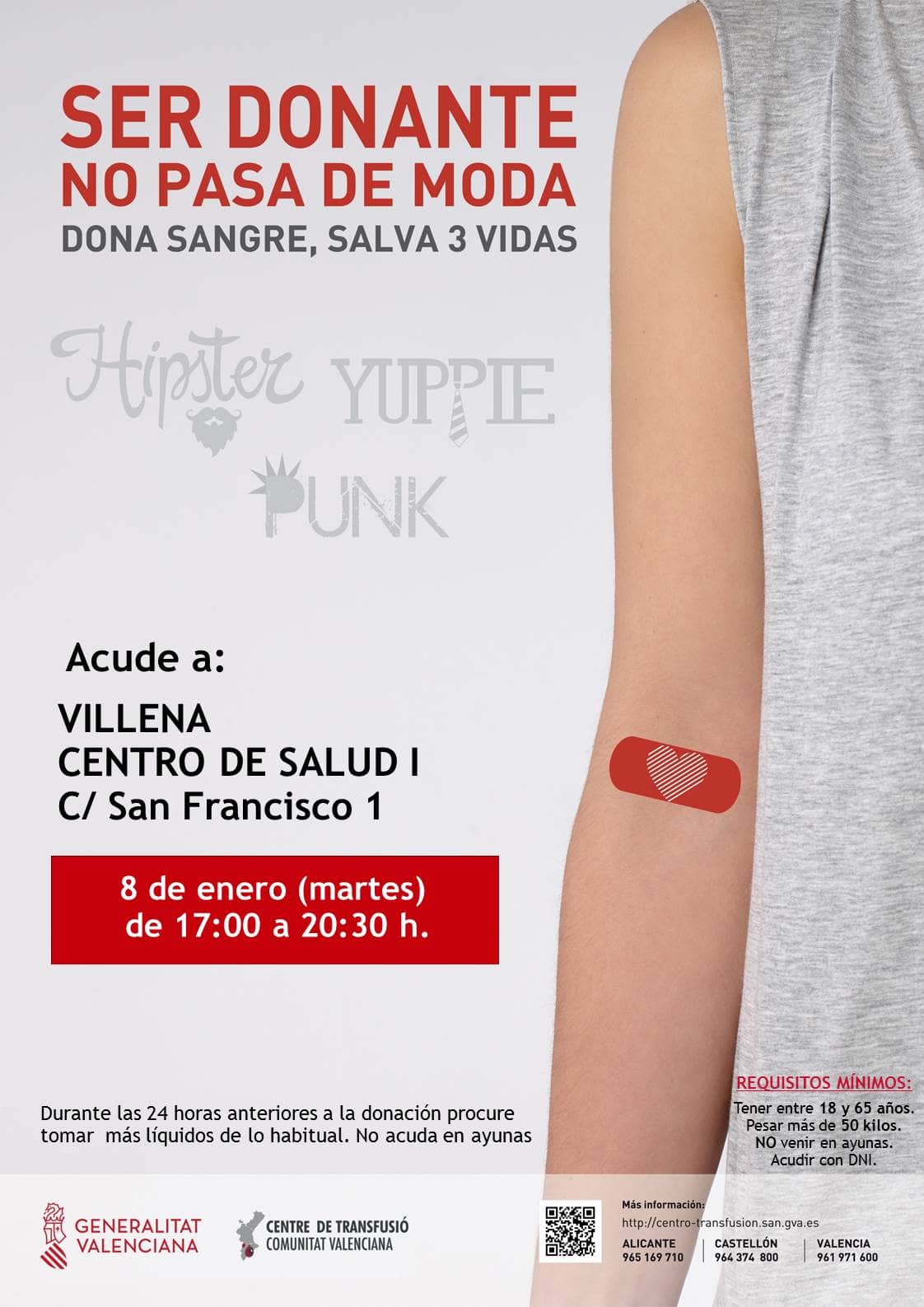 El próximo 8 de enero tendrá lugar una nueva donación de sangre en el Centro de Salud número 1 de Villena de 17 a 20.30 horas.