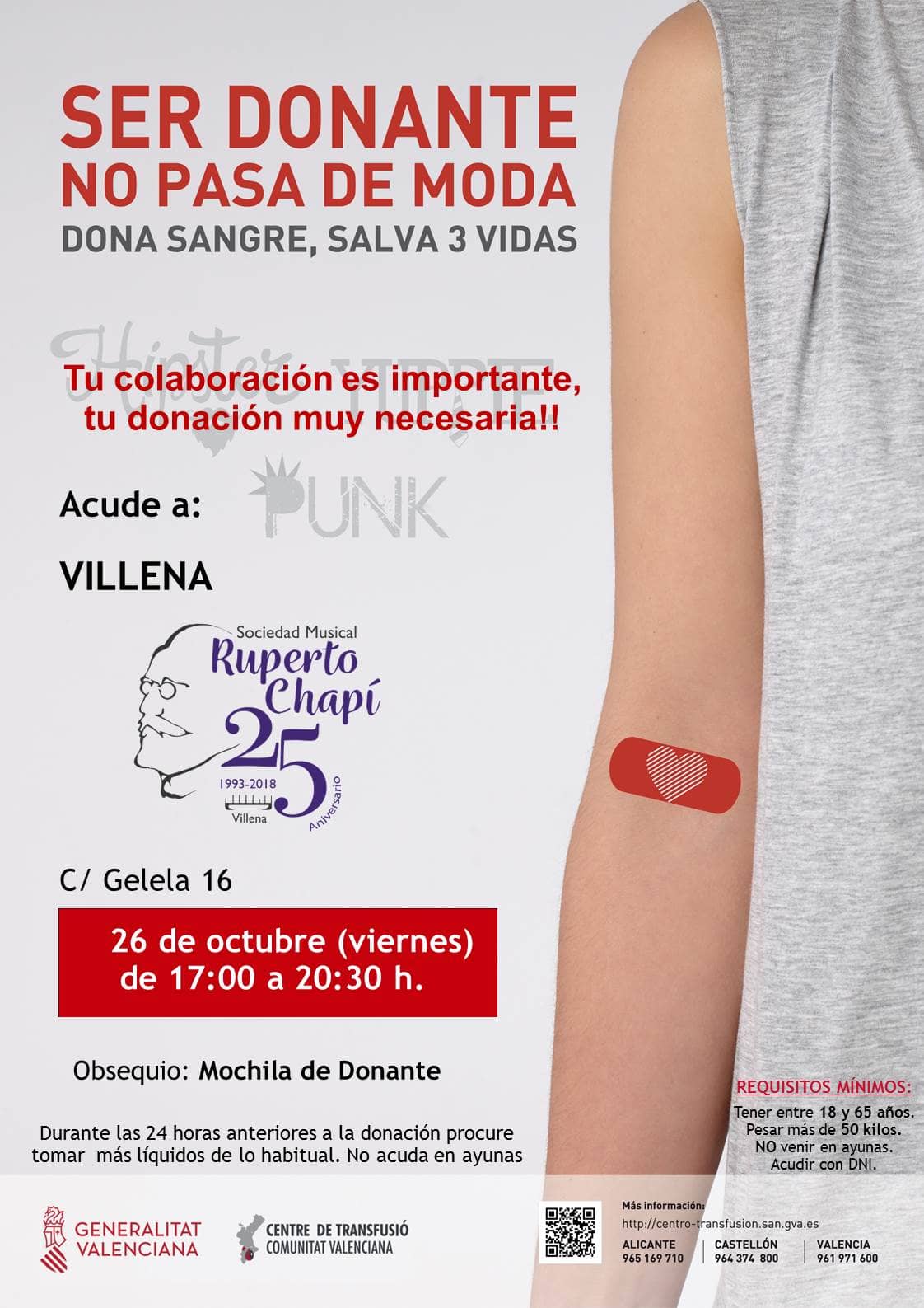 El próximo viernes 26 de octubre habrá una sesión donación de sangre, con motivo del 25 aniversario, de 5 a 8,30 de la tarde en el salón de la Sede de la Sociedad Musical Ruperto Chapí (Calle Gelela 16).