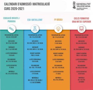 Conselleria de Educación ha presentado el calendario de admisión y matriculación para el próximo curso escolar 2020- 2021 de todos los niveles educativos no universitarios.Es el siguiente: