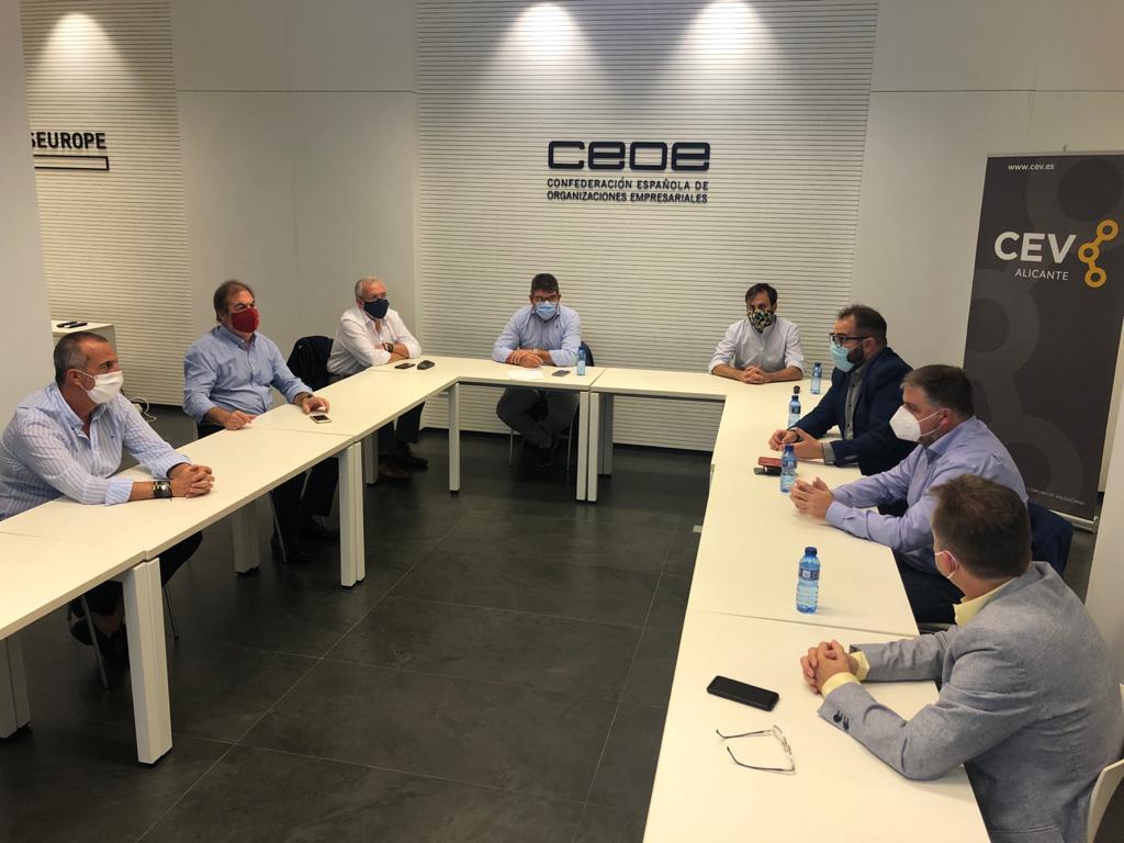 El alcalde de Villena, Fulgencio Cerdán, y el edil de Urbanismo, Javier Martínez, mantuvieron hoy una reunión en la sede de la CEV-Alicante con el presidente de la patronal, Perfecto Palacio, y un grupo de empresarios para explicar el proyecto de Puerto Seco y Zona de Actividades Logísticas (ZAL) de Villena, que puede suponer un impulso al conjunto de las actividades empresariales de la industria de la provincia de Alicante. En la reunión también participaron el presidente de la Federación de Obra Públicas de Alicante (FOPA), Javier Verdú, así como la patronal del transporte por carretera (FETRAMA) con su presidente, Juan José Hernández, y su secretario general, Francisco Ortiz.