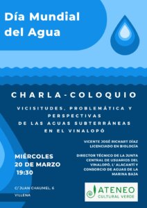 Se celebra una nueva actividad del Ateneo verde. Coincidiendo que el día 22 de marzo se celebra el Día Mundial del Agua, se convoca una interesante charla con este tema como fondo. Bajo el título “Vicisitudes, problemática y perspectivas de las aguas subterráneas en el Vinalopó“, Vicente Richart Técnico de la Junta Central de Usuarios del Alto Vinalopó, explicará la situación actual de nuestro acuíferos, cómo hemos llegado a ella y las perspectivas de futuro.