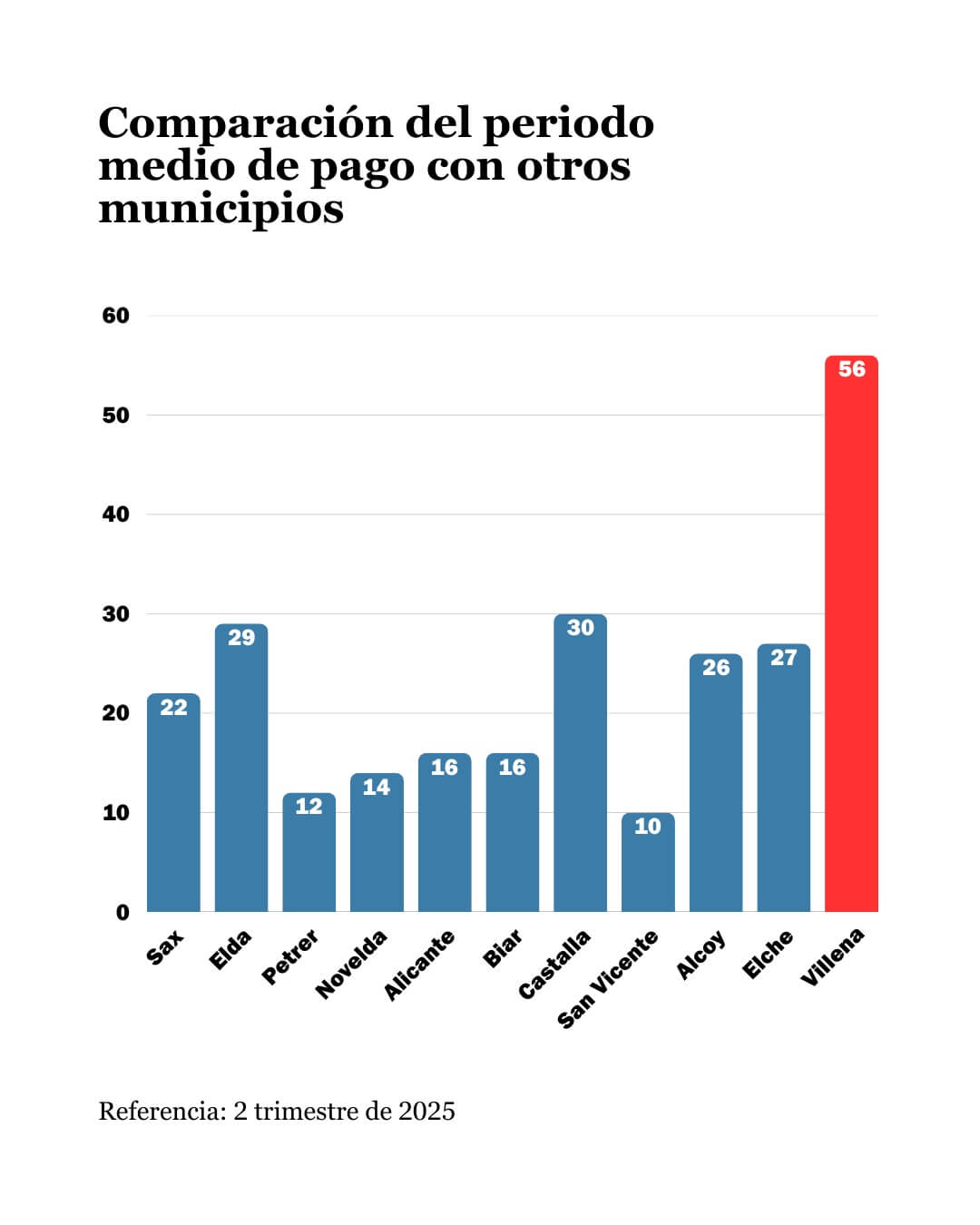 El Ayuntamiento de Villena arrastra un preocupante retraso en el pago a sus proveedores, que en el segundo trimestre de 2025 supera los 56 días de media. Así lo refleja el último informe de Tesorería, que fija el Período Medio de Pago (PMP) en 56,49 días, muy por encima de los 30 que establece la Ley 3/2004 de Morosidad.