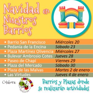 Después de Navidad, las actividades infantiles se retoman a partir del 27 de diciembre, en este caso, en la Plaza Martínez Olivencia; el jueves, 28 de diciembre, será el Bulevar Ambrosio Cotes; mientras que el 29 de diciembre, el escenario elegido será la Paseo Chapí y el 30 en la Plaza del Mercado.