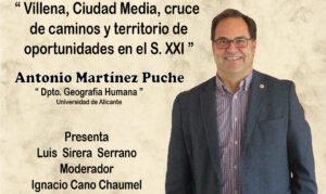 Para este acto contamos con la inestimable colaboración de un gran conocedor de este tema con es: Antonio Martínez Puche, que con el título de “VILLENA, CIUDAD MEDIA, CRUCE DE CAMINOS Y TERRITORIO DE OPORTUNIDADES EN EL SIGLO XXI”, corriendo a cargo la presentación de la misma de Luis Sirera Serrano.