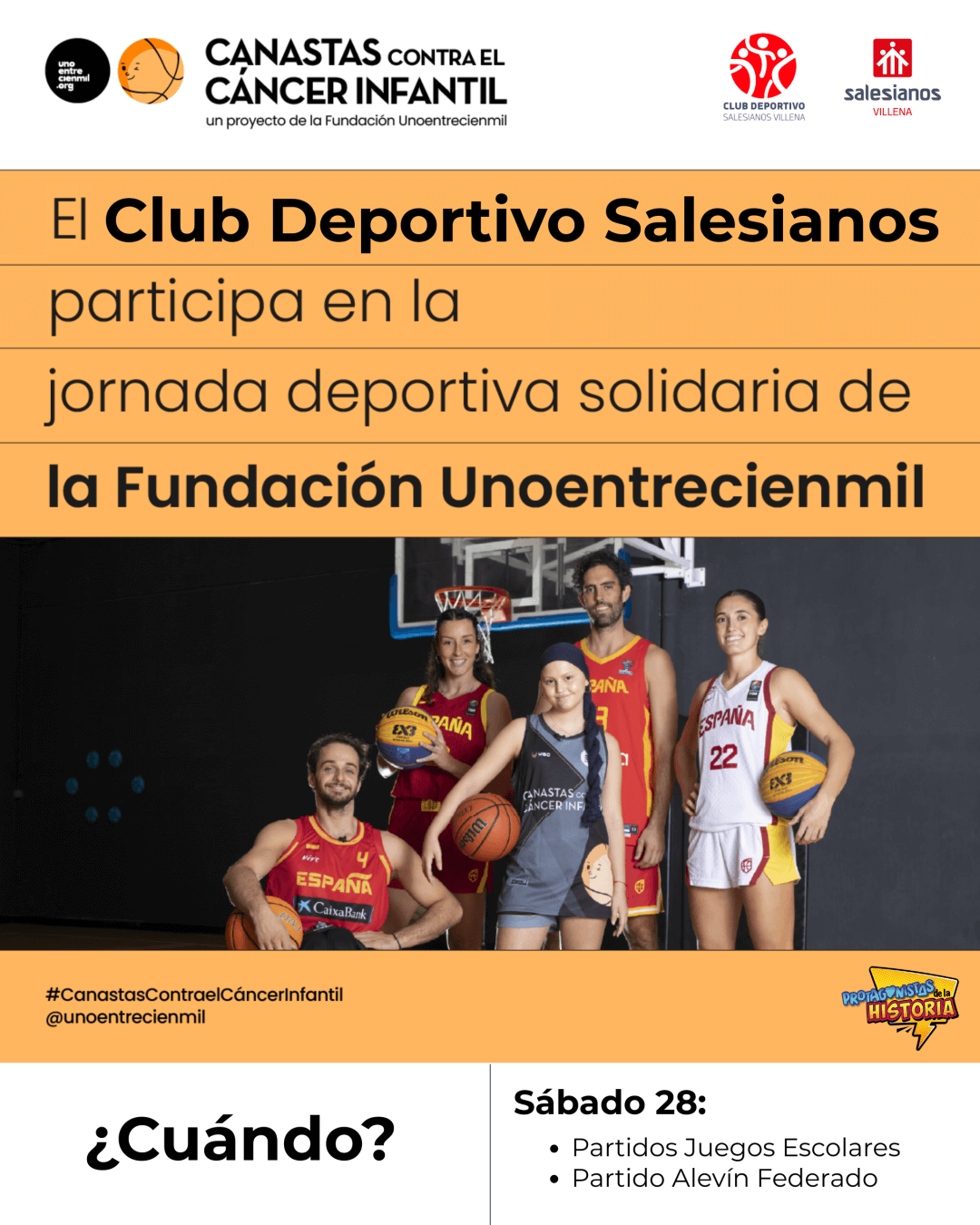El Club Deportivo Salesianos Villena, a través de sus secciones de baloncesto y fútbol sala, se suma durante el mes de febrero a la iniciativa solidaria para impulsar la curación del cáncer infantil, colaborando con la Fundación Unoentrecienmil en las campañas Canastas Solidarias y Goles Solidarios.