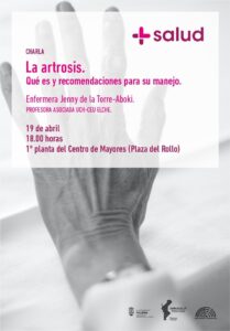 Esta charla será ofrecida por la enfermera y profesora asociada de la UCH-CEU Elche en la que se pretende explicar cuál es el proceso de generación de artrosis, dolencia que afecta particularmente a las mujeres según avanza la edad, y cuáles son las indicaciones de prevención y cuidados para hacerle frente.