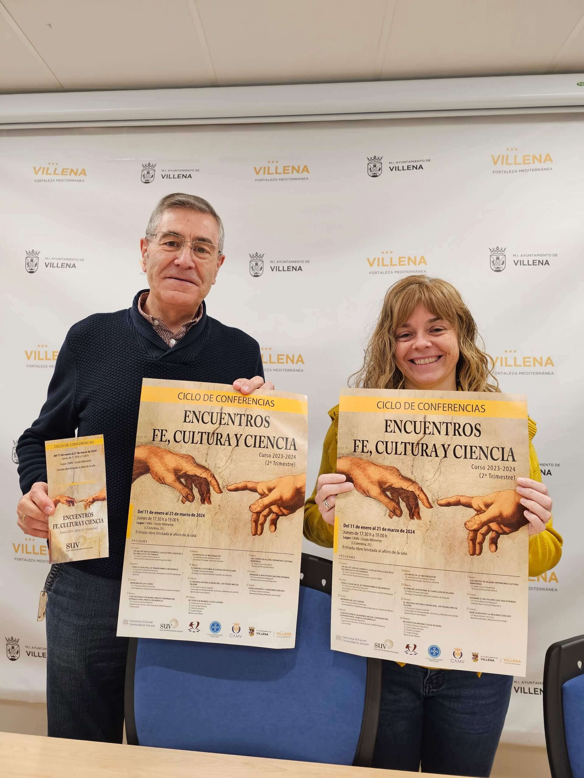 El ciclo de conferencias” Encuentros fe, cultura y ciencia” comienza este jueves 11 de enero y se prolongará hasta el 21 de marzo. Tal y como ha explicado la directora de la Sede Universitaria de la UA en Villena, Esther Perales, en este segundo semestre se hará incidencia en temas locales, como las fiestas de Moros y Cristianos, el Archivo Histórico Municipal o el fondillón, entre otros. Los encuentros se realizan los jueves de 17.30 a 19 horas en el CAMV- Círculo Villenense en la calle Corredera de Villena.
