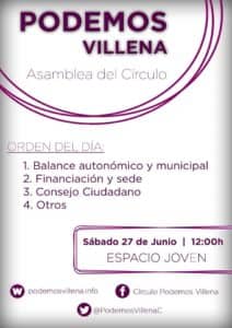 El próximo 27 de junio tendrá lugar una nueva asamblea del Círculo de Podemos Villena. La actividad tendrá lugar en el Espacio Joven a las doce del mediodía. La convocatoria tendrá como puntos principales el balance de los resultados de las pasadas elecciones, la búsqueda y puesta en común de medidas de financiación que nos permitan tener nuestra propia sede e informaremos sobre los cambios producidos en el Consejo Ciudadano.