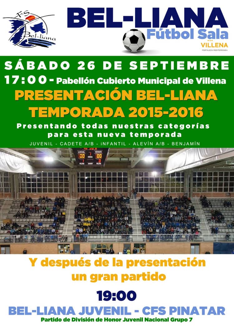 El Juvenil del C.D. Bel-liana, pondrá la guinda a esta fiesta del Fútbol Sala, que será la presentación del club, enfrentándose a las 19:00, en partido oficial, al C.F.S. Pinatar, otro equipo que se encuentra en un gran momento y que llega a Villena para enfrentarse al C.D. Bel-liana ofreciendo las máximas garantías de que viviremos un gran partido y un gran espectáculo en las gradas del Pabellón Cubierto Municipal.