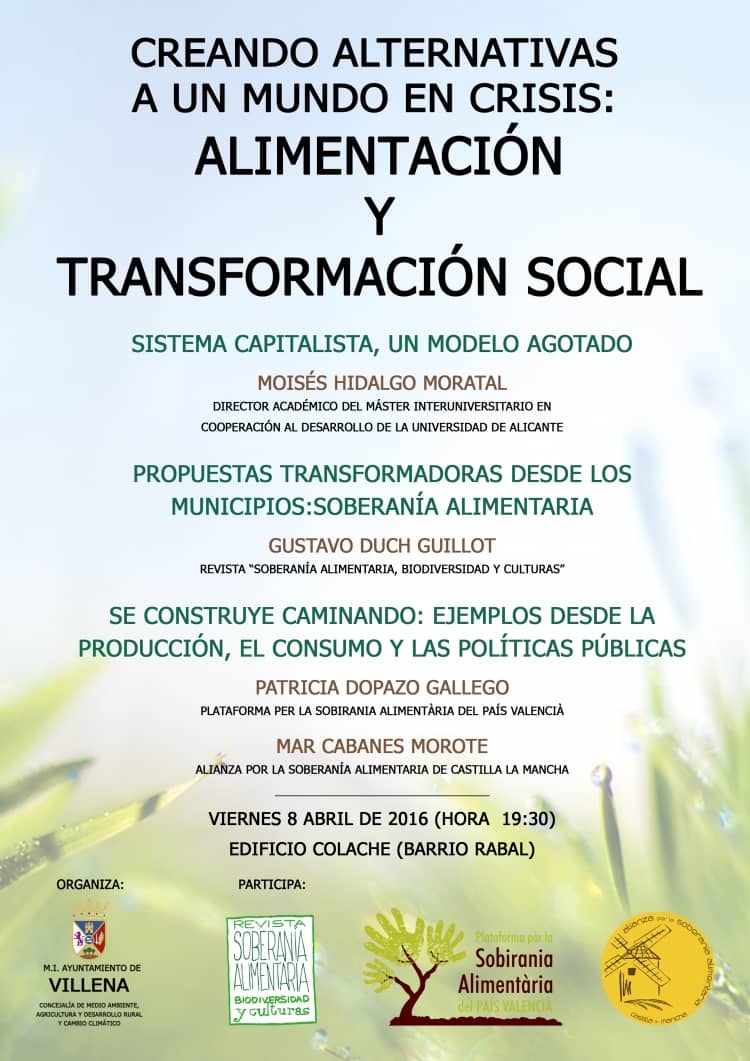 El próximo 8 de abril a las 19:30 en el Edificio Colache del Barrio El Rabal de Villena, tendrá lugar la jornada de debate ‘Creando alternativas a un modelo en crisis: Alimentación y transformación social’, organizada por la Concejalía de Medio Ambiente, Agricultura, Desarrollo Rural y Cambio Climático del M.I. Ayuntamiento de Villena.