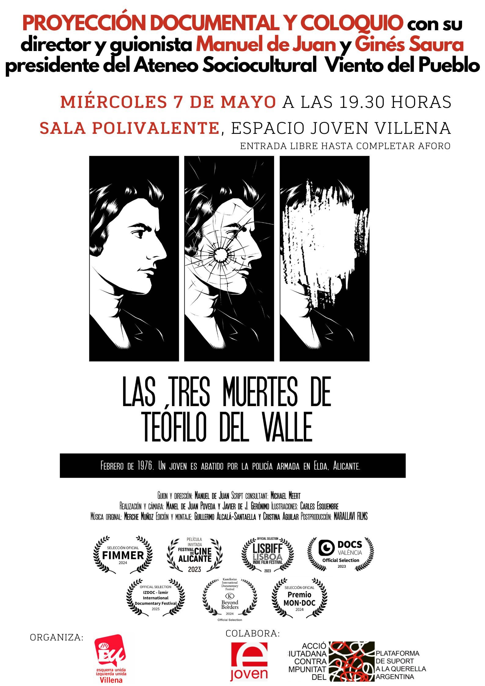 Izquierda Unida de Villena organiza la proyección del documental Las tres muertes de Teófilo del Valle con su guionista y director Manuel de Juan, quien vivió en primera persona los acontecimientos que se suceden en el documental. Manuel de Juan, reclama con la película justicia y reparación para Teófilo del Valle y otras víctimas de la dictadura.