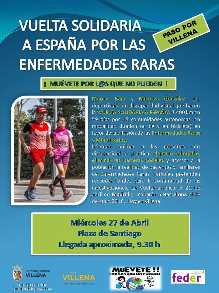 Villena acoge el miércoles 27 de abril, una de las etapas de la vuelta solidaria por las enfermedades raras a las 9.30 h en la Plaza de Santiago, dentro del Proyecto de difusión.