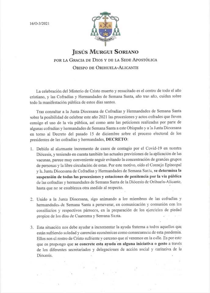El obispo de Alicante-Orihuela, Jesús Murgui, ha firmado el decreto por el que se suprimen todas las procesiones de Semana Santa y las estaciones de penitencia por la vía pública de las cofradías y hermandades de la Diócesis, “hasta que no se establezcan otras medidas al respecto”.