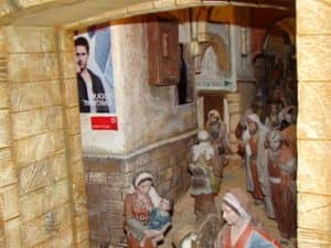 Este 28 de diciembre la calle más concurrida de belén, por unas horas, pasó a ser la calle Preciados de Madrid. Al fondo se observaba la escultura y escudo de la capital de España, el oso y el madroño. Estatua vinculada a Villena por ser su autor el artista villenense, Antonio Navarro Santafé.