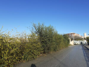La actuación solicitada en esta ocasión es en la calle San Benito, que es la calle de acceso al Instituto Navarro Santafé, la Escuela de Adultos y al colegio Ruperto Chapí por su entrada lateral. La vegetación, en este punto, ha crecido tanto que impide que circulen dos vehículos por una calle que es de doble sentido.
