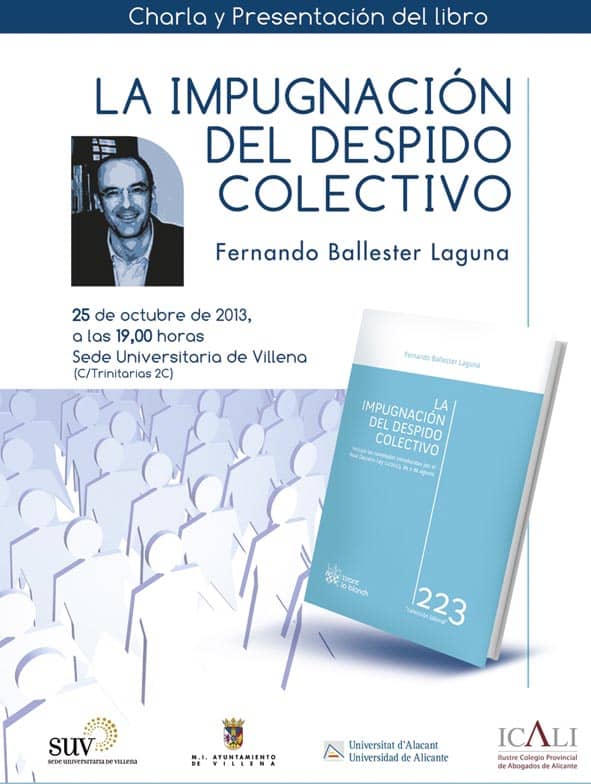 En un año marcado por la regulación de los despidos colectivos, el profesor del Área de Derecho del Trabajo y la Seguridad Social de la Universidad de Alicante, Fernando Ballester, presenta su libro “La impugnación del despido colectivo” en la Sede Universitaria de Villena. Durante el acto, que tendrá lugar el próximo viernes 25 de octubre a las 19 horas, Ballester desgranará el contenido de su obra fruto de una investigación sobre la fisonomía de los despidos colectivos.