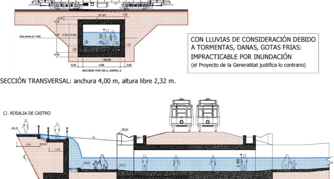 La propuesta de paso peatonal que plantea el Proyecto de la Generalitat para cruzar las vías del ferrocarril está resuelto mediante un túnel subterráneo al que se accede desde ambos lados de las vías férreas. Paso peatonal que en el lado residencial se sitúa en un triángulo de zona verde entre las vías del tren y Rosalía de Castro enfrente del final de la calle Virgen de la Cabeza, y que se resuelve mediante un intrincado, tortuoso y laberíntico entramado de rampas y escaleras de geometría incierta. Y en el margen opuesto, el conjunto de rampas y escaleras hasta ascender a la cota cero, se desarrolla alrededor de una amplia superficie de planta seudo elíptica destinada al embalsamiento de las aguas de lluvia, según una geometría inclasificable, con el único fin de llegar a ningún sitio: a un vial innecesario no contemplado en el Plan General, que aleja a los peatones de las zonas industrial y agrícola del otro lado de las vías. Paso peatonal subterráneo que se inundará cuando llueva copiosamente tal y como se grafía en el plano adjunto.