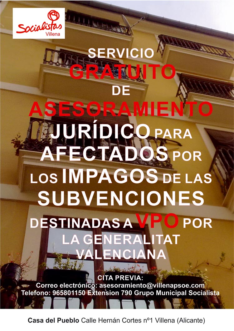 El PSOE, a la vista del gran quebranto económico que supone a muchos villeneros, el impago de las Subvenciones a la compra de vivienda de protección oficial de la Generalidad Valenciana, ha habilitado un servicio de asesoramiento jurídico con el fin de proceder a reclamar a Gobierno Valenciano el pago las cantidades de dicha subvención.