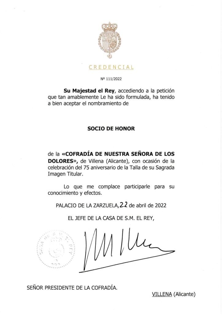 Después de 2 años de gestiones al respecto el Jefe del Estado, Su Majestad el Rey Felipe VI ha aceptado el nombramiento como Socio de Honor de la cofradía de Nuestra Señora de los Dolores de Villena con ocasión de la celebración del 75 aniversario de la Talla de su Sagrada Imagen Titular.