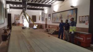 Una de las mesas de grandes dimensiones que se encontraba en el antiguo edificio de la Electroharinera ha sido ubicada en el salón regio del Santuario de Nuestra Señora de las Virtudes en Villena, tal y como acordó el Ayuntamiento, para el disfrute ciudadano.
