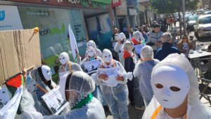 Ataviadas con monos blancos y caretas inexpresivas, veinte personas de la plataforma encabezaban un grupo en el que unas 50 personas han protestado por el genocidio que comete Israel en Palestina y ahora en el Líbano.