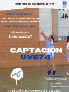 El viernes 27 de mayo se llevará a cabo la captación de jugadores del club de baloncesto V-74 de Villena pensando en la próxima temporada 22-23